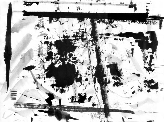 Keith Ikeda-Barry combined line drawings with dynamic ink splatters, and specific areas of accent colours.